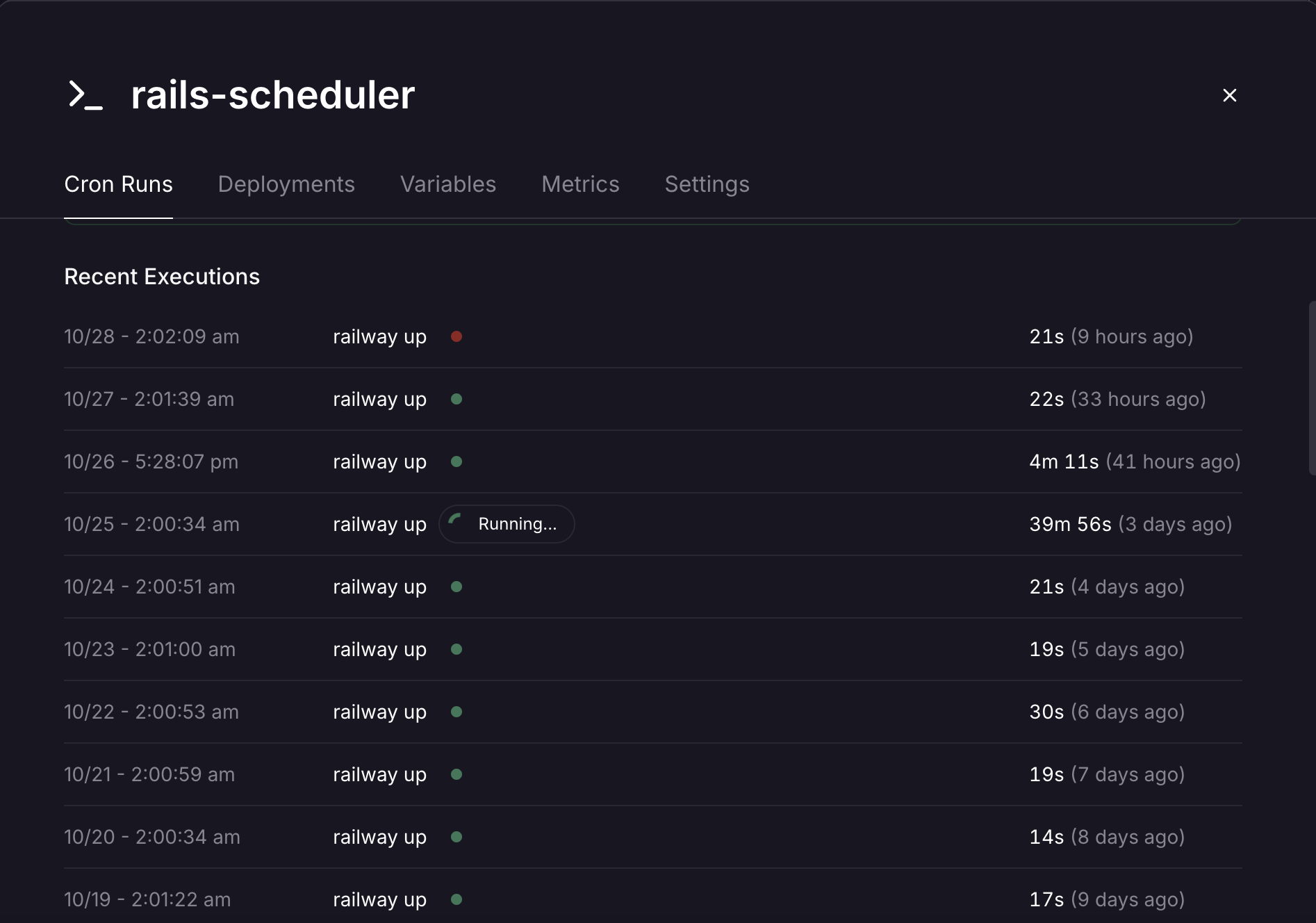 One of my services runs on a schedule, and I can see its history in the dashboard. Normally, once it's done, I see that time it ran in a list of deployments, along with an indicator of success or failure.