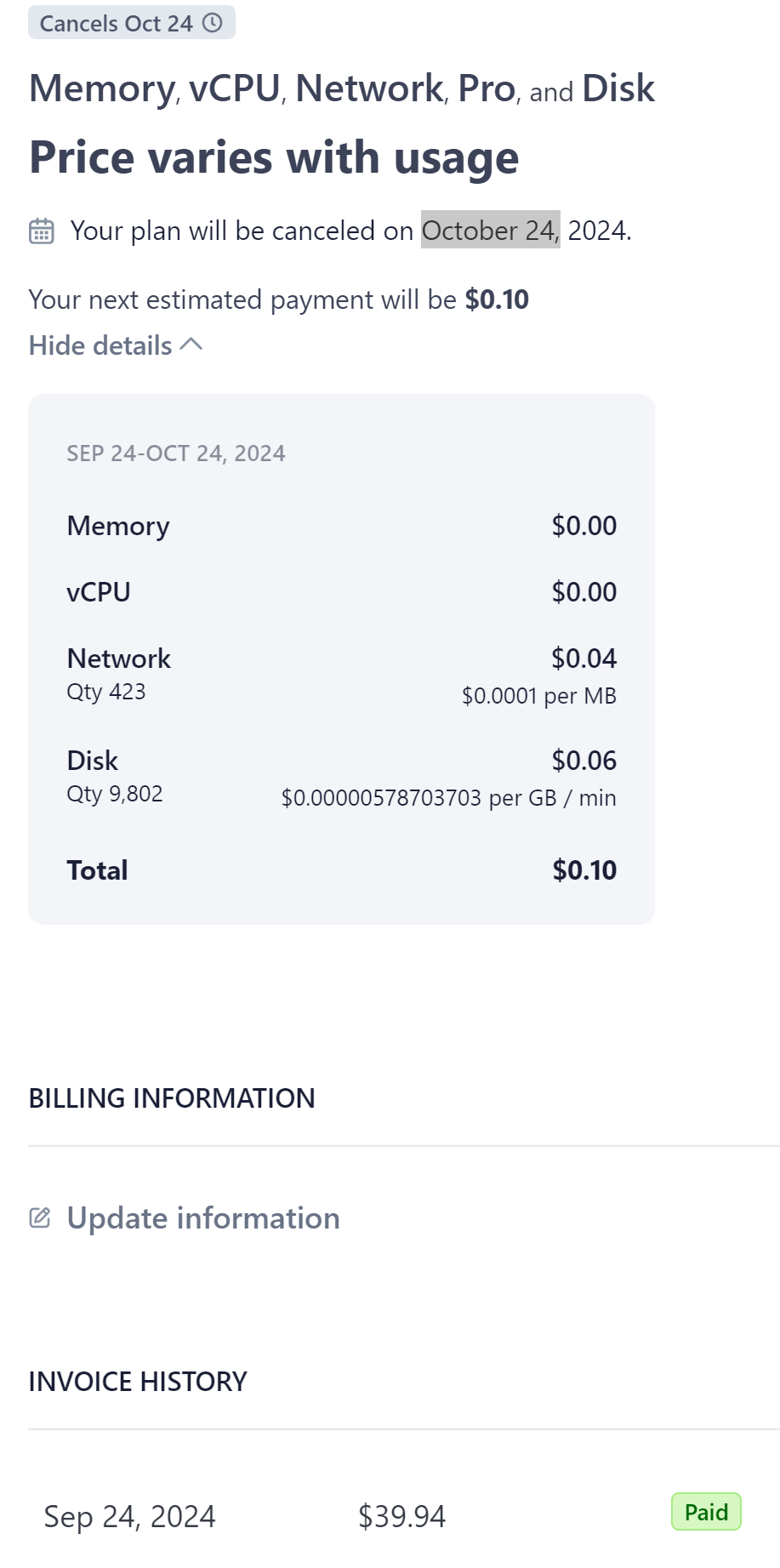 And now it still says estimated bill $20 on the railway page, and estimated payment $0.1 on the billing page